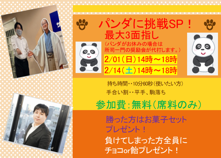 • 持ち時間 10分60秒(🐼先生は10分60秒)感想戦は軽めになります。
