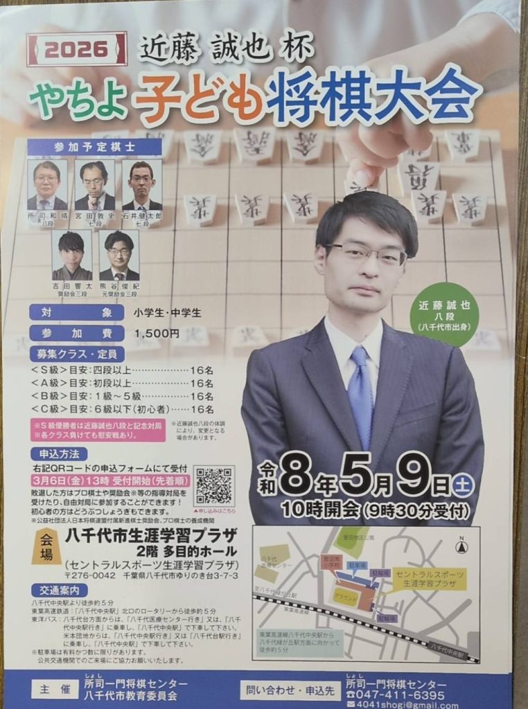 八千代市出身の近藤誠也八段がお世話になった八千代市で近藤誠也杯やちよ子ども将棋大会を開催します。